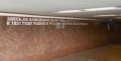 глухом торце станции расположен портрет Ф. М. Достоевского, выполненный в
